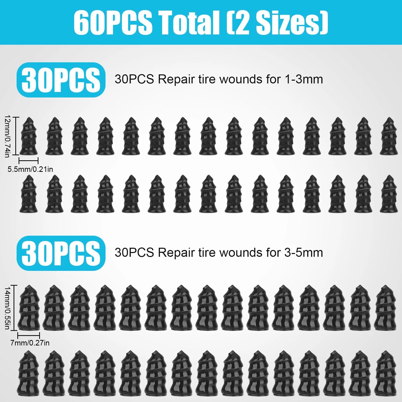 • 2 Sizes: 60PCS total and we provide 2 sizes of tire repair nails for you, smaller one is approx. 0.21 x 0.46 inch and larger one is about 0.27 x 0.5 inch. Professional puncture repair nails can be used on cars, motorcycles trucks buses, and agricultural tires.
