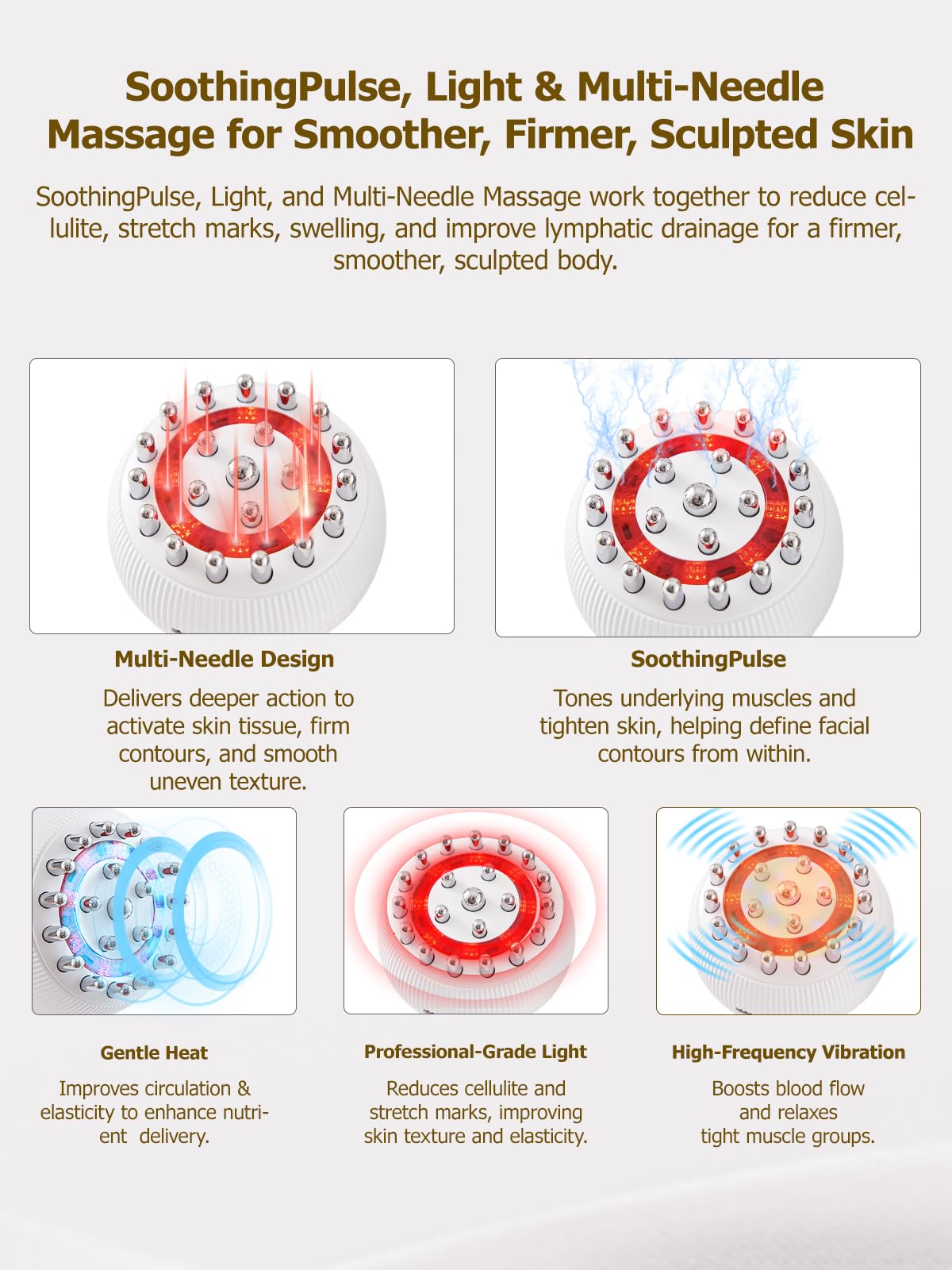 - Advanced Lymphatic Drainage– Reduce Swelling & Detox Naturally: This lymphatic drainage massager uses multi-needle pressure and SoothingPulse technology to boost lymph flow, reduce water retention, and promote fat metabolism. It helps relieve swelling, bloating, and puffiness while leaving your body feeling lighter, more energized, and well-shaped.